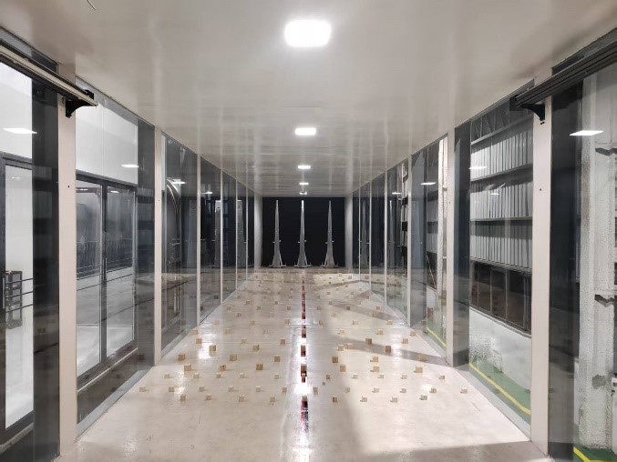重庆科技大学回流式风洞主体材料为钢结构,洞回路中心尺寸为36.85m(长轴)×13.5m(短轴),试验段尺寸:3m×2.5m×16m(19m)(宽×高×长),稳定段尺寸:5.4m×6m×5.65m(宽×高×长),最大风速为50m/s;风洞试验段下游设计了转盘,通过控制程序即可进行自动转动;在试验段中部底部设置可拆卸的地板,给需要的试验支撑装置预留出口,便于安装调试等工作。风洞实验室配有眼镜蛇湍流测速系统、高精度测力天平、电子扫描阀、加速度及位移传感器、动态位移图像识别测量装置等测试设备,能满足绝大部分结构风工程的研究。